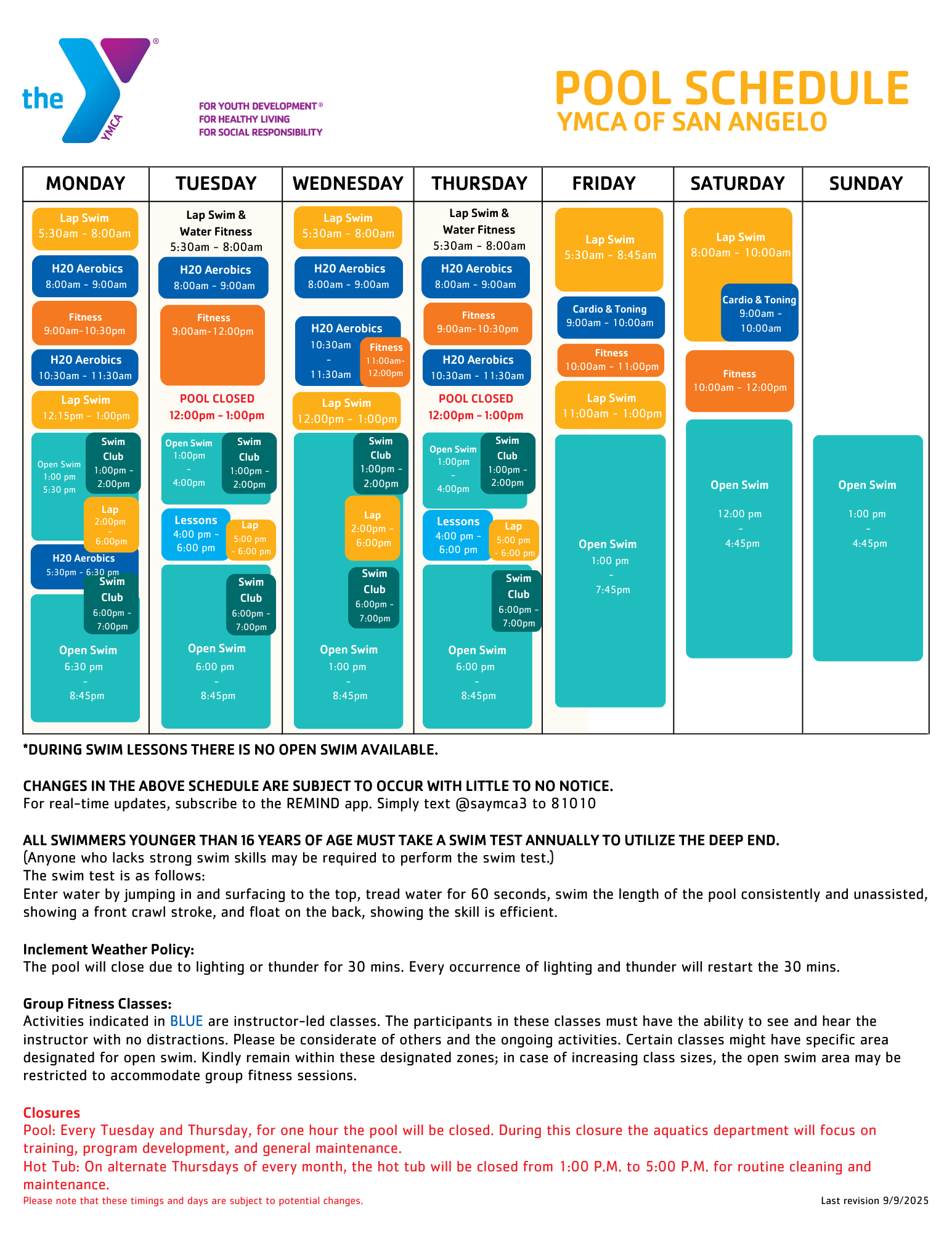 There have been some changes to the Fall pool schedule. Please pay close attention to the major changes:
